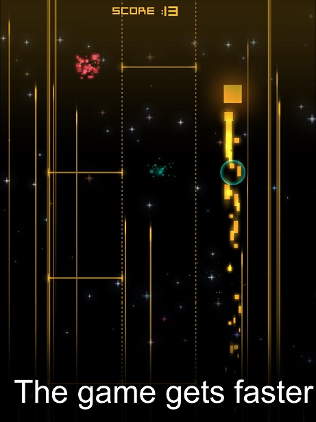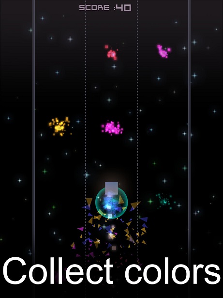游戏玩法与经典的俄罗斯方块版F1躲避车很相似,但《彩虹跑》的亮点可不是这简单的规则。看看充满着流光溢彩的游戏截图吧,咱们的这颗“彗星”是会变色的。当它在飞行过程中吃到不同颜色的的几何图形后,自身和赛道的颜色都会改变,吃到两个后颜色会更深,连续吃到三个同色几何图形就会引发无敌的暴走模式!在暴走模式下,一切障碍都是浮云了,狂飙突进的“彗星”周围会充满速度线,那速度感别提多带劲了!不过玩家飞行距离越远,画面中会出现的不同色彩图形就越多,要集齐三个也会越困难的,这就是游戏的乐趣和难点。