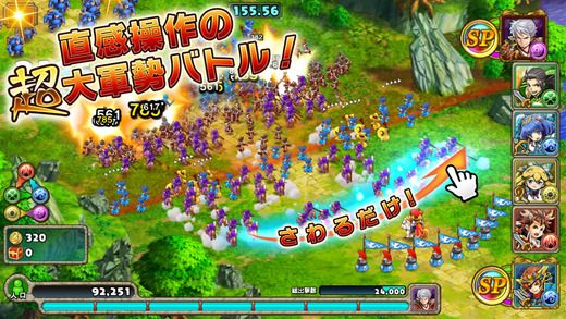 游戏主打单指操作,顾名思义,玩家只需要一根手指即可完成整个游戏过程。在游戏战斗界面中,玩家点击屏幕右方的英灵头像进行英灵切换,然后点击红色屏障以下的战斗区域即可召唤军队进行战斗。更方便的是,玩家从左到右或者从右到左滑动屏幕,即可同时召唤3支军队为你作战。当然所消耗的人口数量也是乘以三倍啦。需要注意的是,游戏每回合都有指定出战的人口数量限制,当人口消耗完毕,战斗就要被迫中止,属于游戏失败啦。