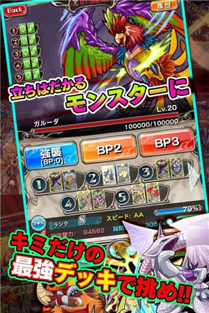 在本作中,与BOSS怪兽战斗时是以“卡组”来进行的。在一场战斗中,大家要用合计10 张武具卡来构筑卡组。BOSS 角色也都分别持有固有的卡组,要以“卡组之间”来跟BOSS 角色战斗。卡组战斗是一次战斗中用最多10 张卡片,在五回合内决胜负的系统。一个回合可以设定2 张“武具卡片”卡组。每一个回合都会以2张vs2来进行攻击判定,会给予双方HP损伤。最终在第五回合结束时将BOSS 角色的HP 打到0 的话就算战斗胜利,如果无法将HP 打到0,或者玩家HP 先归0 的话就是战斗失败。必须一边守护自己的HP 来削减对方的HP。