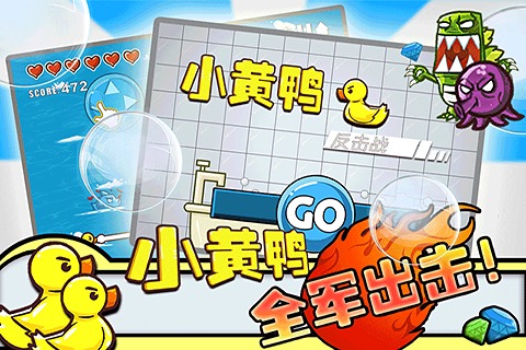 控制小黄鸭移动,小黄鸭的水球泡泡会自动追踪海怪,每杀死一只海怪会随机掉下金币,通过收集金币购买装备升级火力。