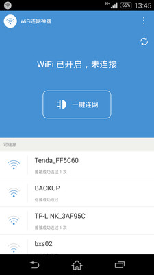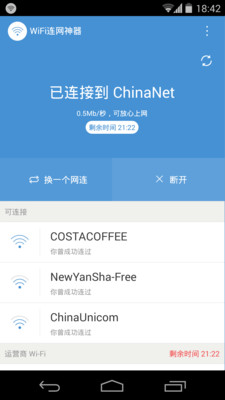 《WiFi连网神器安卓版》这是一款非常好用的手机WiFi工具。软件功能强大,使用简单方便,一键即可移动、电信、联通等加密WiFi热点,让你能够随时随地看小说、看电影、看新闻,再也不用担心流量不够。