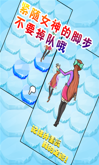 游戏共有两个模式可选,模式一:依靠玩家的反应能力和手指速度来追逐前面的女神,玩家只能走其走过的格子,如果走错格子或没有跟上女神游戏将结束。女神每次加速之前会脱掉一件衣服减轻负重进行加速,在加速之前,女神会隐身,随机走若干个格子,玩家需要通过记忆力记住女神走过的步子,重新走一遍,游戏继续进入普通模式。