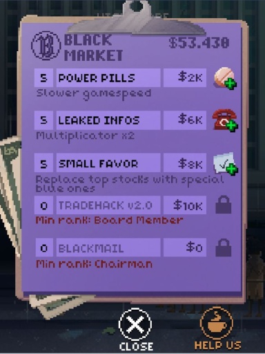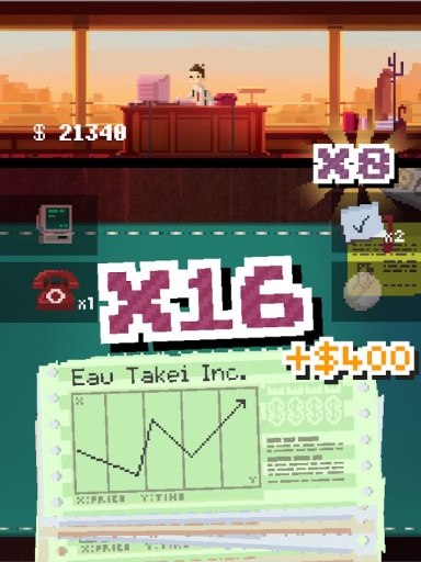 游戏的操作和玩法非常简单直接,玩家扮演的操盘手会以极快的速度(或者说极其敷衍的态度)将一份份的市场股票走向文件浏览过去,看一眼之后火速决定是否要买进,然后将它丢到相应的一边去就行了。需要注意的是呈绿色的股票要在上升的时候才能买进,而呈红色的股票要在下滑的时候买进,这样才不会给公司带来损失。如果不小心选错了或者决策的速度不够快,那么恭喜你:你被开除了…接下来失业的操盘手就彻底绝望了,从公司的高楼跳下去自杀了…