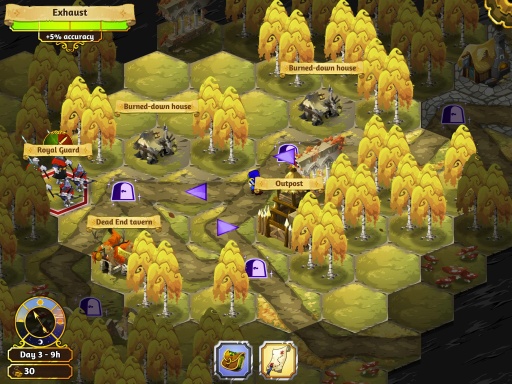 游戏中,需要玩家打败占领领地的怪物、强盗和乱军。而在战斗中需要玩家操控角色在六边形的格子内进行移动,这里的操作是经典的SLG设定,不同的兵种拥有不同的身板和伤害,而通过不同的角度进行攻击也将带来不同的伤害量。攻击顺序、攻击位置、佣兵的站位进行合理的搭配组合就可以实现以少胜多的效果。