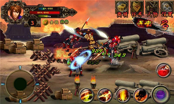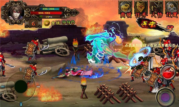 进入游戏后,画面左上方显示为主角头像,体力,血条,经验条,等级和金钱,右上方的从右到左分别为设置,人物,任务,商城等功能按钮。