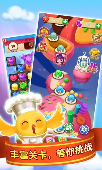 在甜点世界冒险中,你将面临各种挑战!如收集各色美味的蛋糕,击碎巧克力障碍,拯救被困住的小鸟,消灭腹黑邪恶的泰迪熊!千万不要掉以轻心哦~~