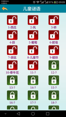 1.内容丰富,总共分为猜地名,猜汉字,猜动物,猜物品,猜植物,中秋猜谜6大类。