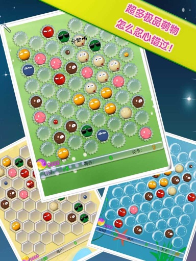 游戏非常简单,集合相同颜色的六个球球精灵就可以消除得分!上手容易,但想玩好成为高手却是不易!各种各样的元素,可爱又萌萌,让你爱不释手,想停都停不住!无聊时休闲时打发时间的精品游戏!