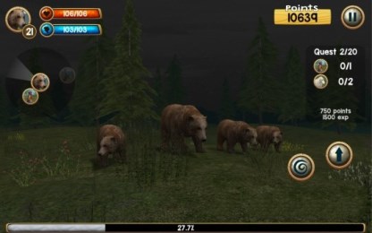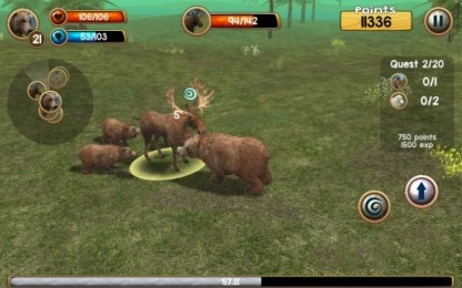 游戏中玩家扮演的是一只野熊,它到处游走,只为找到自己的家人。但是途中,它会饥饿,所以你可以控制它去猎杀其它动物,在战斗前,要保证体力足够,否则无法使用攻击动作。游戏右上角还有指定的任务,完成它们,可以得到更多的经验。