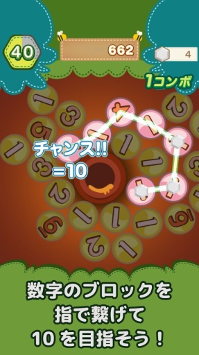 游戏玩法十分简单,只需把屏幕上的数字连起来,合计等于10的话即可消除,如连起来不等于10(例如8),则会留下结果这个结果数字(8)。如果你是数学苦手也不用紧张,因为连接时游戏会提示目前相加数值,完全不用担心算错!