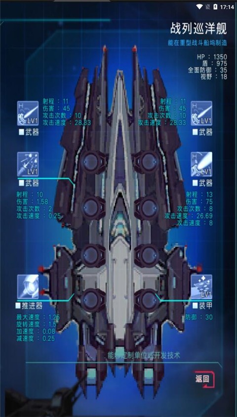 4、游戏中有多种舰船供你建造升级。你需要根据局势,采集资源,建造攻击舰,防护自己的母舰,同时击败外星生物。