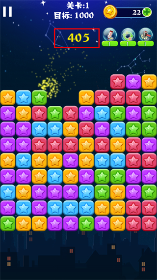 3、然后点击相邻的同颜色星星就能够将星星消灭,并且获得分数。相邻的同颜色星星越多,获得的分数越多