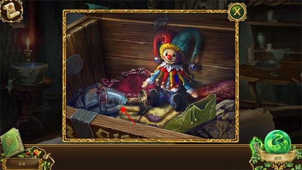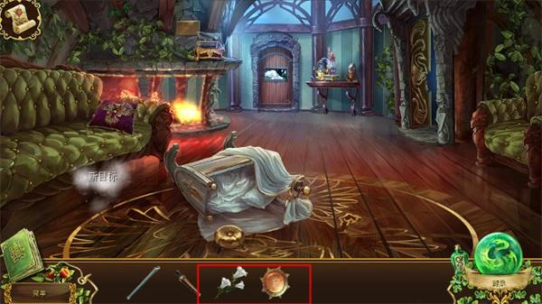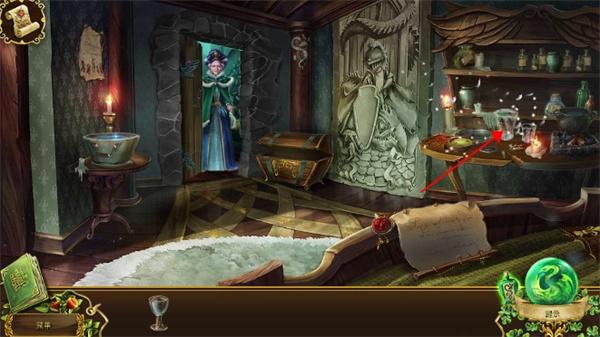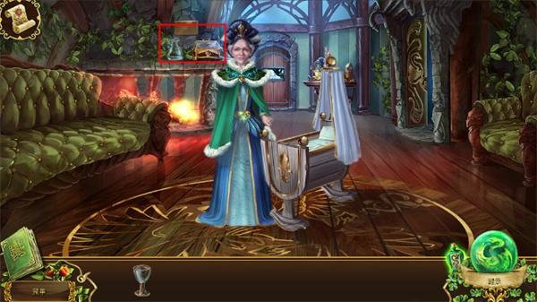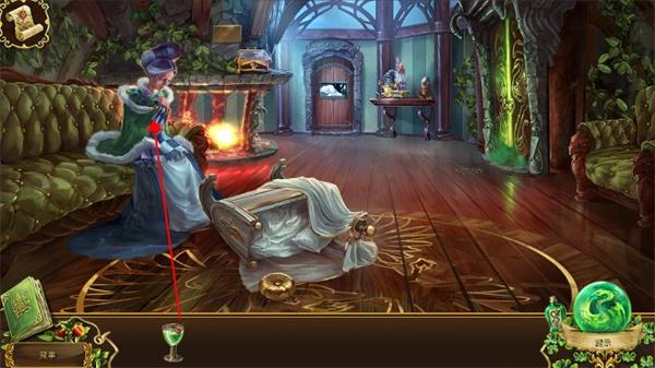 5、点击门口来到客厅,首先用放大镜为皇后查看一下,看到她眼睛和手都不太正常;接着皇后抱着孩子进入了房间,在客厅中我们可以在地板上找到第2个医师符咒,在壁炉上得到一个空水瓶。