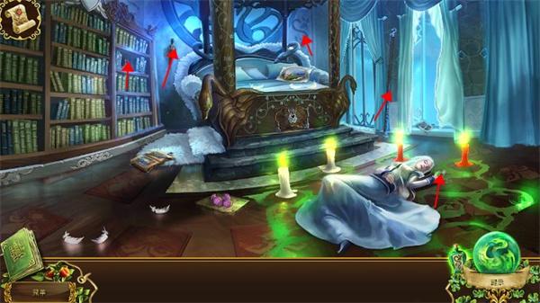 12、回到皇后的房间,点击书架,将太阳石放入凹槽中,进入一个机关。按要求操作就能打开暗门。