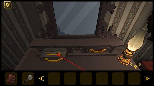 1、在镜子下方的抽屉里获得钥匙,用钥匙打开房门,点击沙发查看信件。
