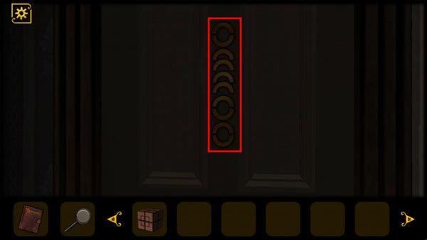 6、利用门上的花纹打开关着的房门,分别是右一、左二、右二,进门后查看小桌子上的书籍,看到墙上的钟表黄色指针指向lX。