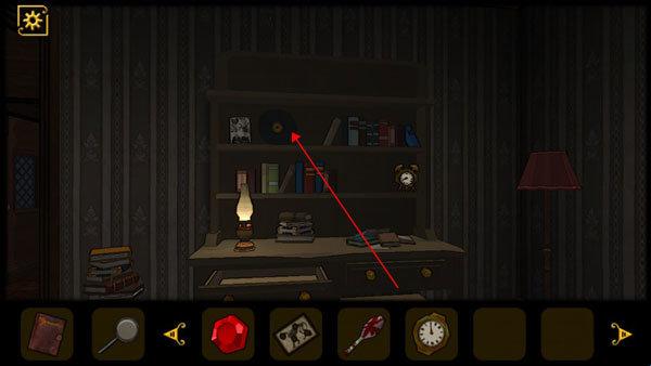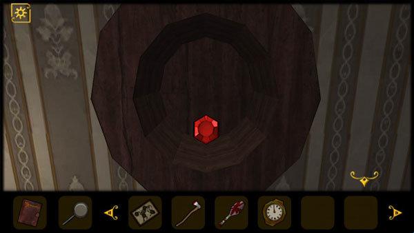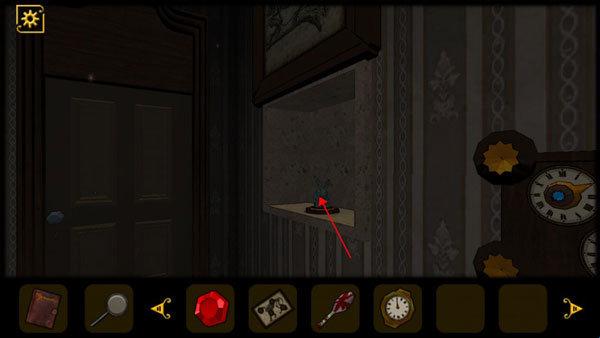 5、查看桌子抽屉,获得道具和查看日记,将红色机关石放入墙上的红色凹槽中,回头会发现进门处出现一只怪物,将门关上,注意门上的花纹。