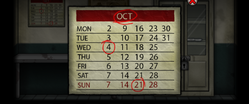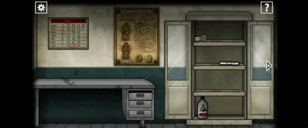 1、醒来后出门到第四个房间(医务室),观察墙上的日历(OCT是十月英文的缩写)获得密码「10421」,接着输入密码打开下面的抽屉获得「一串钥匙」。