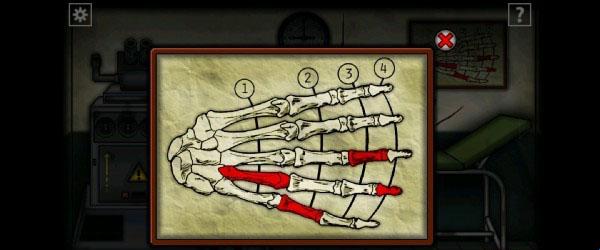 2、出门用钥匙打开旁边医务室的门,进入房间后观察墙上的手骨。接着在来到外面根据红色指骨的位置打开暗格获得「钥匙」,正确顺序是:①和②各往下四格,③和②各往上一格。