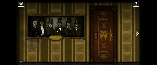 6、通过电梯来到一层,先往左走进入第一个房间拿走左下角的「蓝色弹珠」。点击画像,观察帽子上的符号。