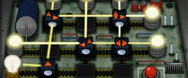 11、将灯泡装在面板上,再将方块移到正确的位置上,接着点击红色按钮使所有灯全部亮起。