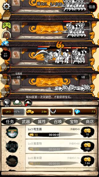 无限之塔中文版是一款以漫画风格为题材的无尽闯关游戏,同时也是一款放置类的模拟爬塔游戏,该游戏拥有无尽的关卡和数不完的挑战,玩家可通过扮演的角色来完成无限之塔的挑战,期间玩家可通过挑战每层的敌人,来获取金币和钻石,利用金币和钻石的资源来进行武器、召唤、属性以及宝物的加持,多角度的战力加成养成,会让玩家的挑战变得更加轻松。与此同时,游戏中还有各种不同类型的道具,以待玩家们选择和参考。