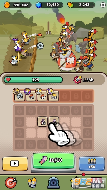 《duckchicke》是一款以保卫养鸭场为主题的闲置防御游戏。玩家的任务是守护养鸭场,抵御狂暴鸡群的侵袭,阻止它们夺走农场里的鸭子。游戏中,玩家可通过合并导弹来装备更强大的武器,让滑稽的鸭子同伴发射导弹击退敌人。还能雇用具备减速、击退等能力的鸭子队友,升级它们以增强防御策略。