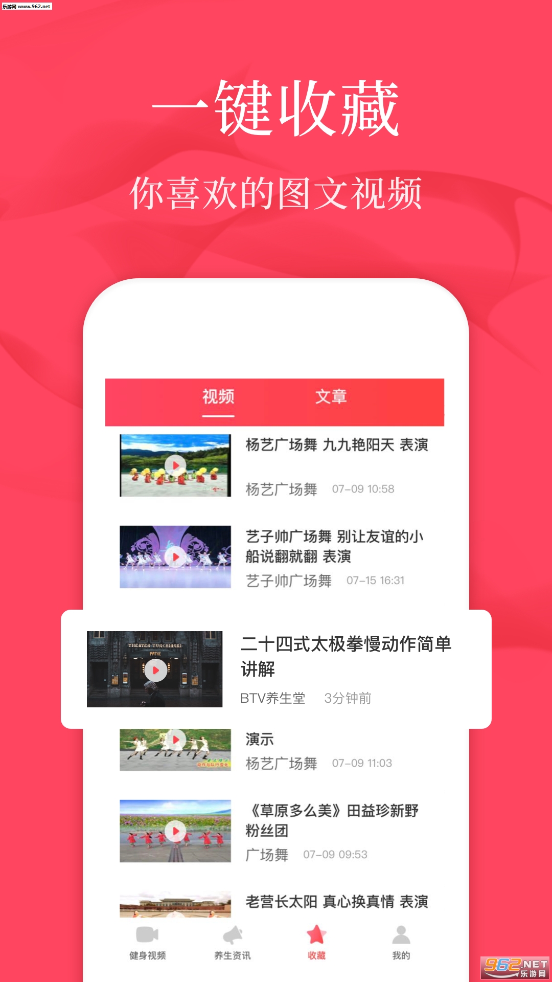 为大家带来初学广场舞安卓版下载,在这里你可以直接通过视频来学习各种广场舞,了解相关的养生资讯动态,记录你的运动情况,也能够随时随地收藏你喜欢的图片文章,快下载吧!