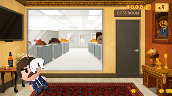 此刻的你也许工作不顺利,又或者刚被老板狠狠的教训了一顿,甚至有一个特别讨厌的人。但从现在开始,他的命运将由你来决定。通过这款暴打老板3中文版能够实现你的梦想,你终于也可以痛扁你的老板了。这是一款玩起来非常解气的发泄题材的休闲手机游戏,刚进入界面,一个眉头紧凑目光呆滞的老板形象映入眼帘。还在训斥员工的他,殊不知到炼狱正向他袭来。单从初始场景来看,办公室金碧辉煌的设计,加上液晶电视和挂像说明这老板不一般。