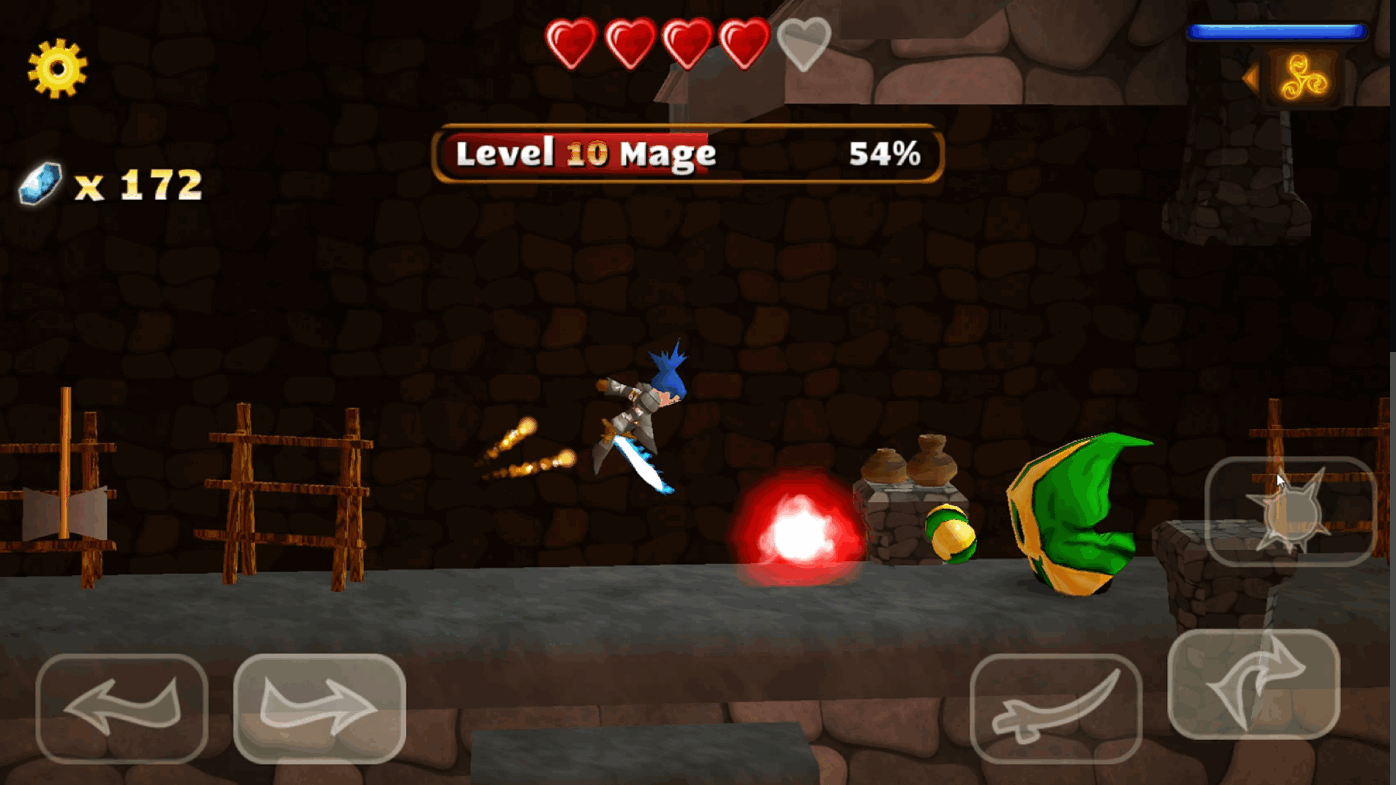 如下图右下角所示,图标为一个魔法弹的即为魔法攻击键,点击可进行魔法攻击。右上方为魔法能量条,当蓝色能量条为0时玩家无法施放法术,能量条会按时间自动填充能量,当然,也可以在游戏中获取小蓝瓶直接补满能量。