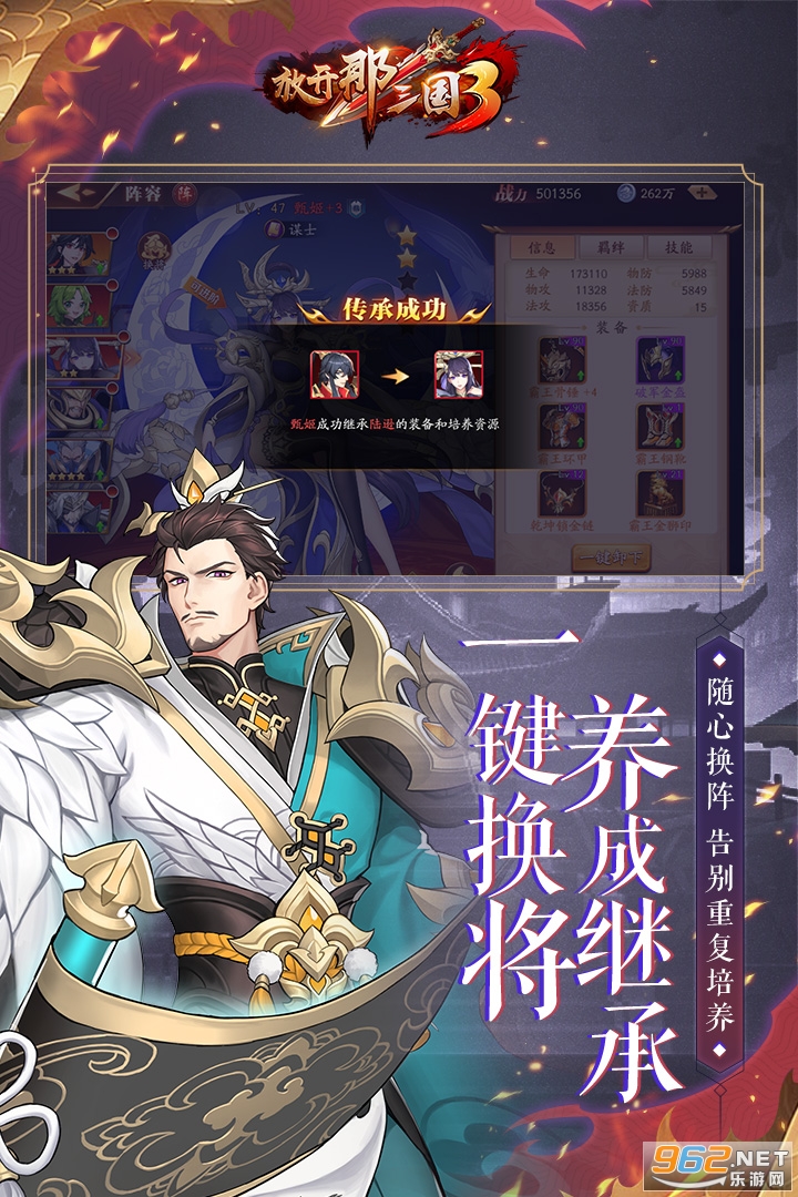 无需担心重复培养武将的问题,点击“换将”即可将目标武将更换上阵,同时继承被更换武将的装备、进阶、等级等养成资源,轻松搭配出多种作战流派阵容以应对不同敌人。