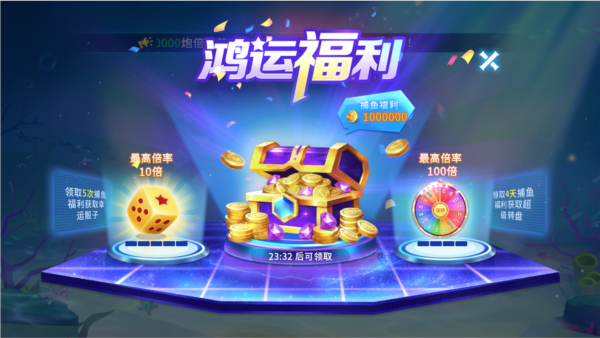 包含史前巨鳄、熔岩龙龟、深海巨兽等五大BOSS。史前巨鳄专为萌新设计,完成新手任务即可领取金币、弹头与道具卡;其余渔场则主打“福禄抽奖”——击杀黄金鱼或BOSS可累积福禄值,存满后参与抽奖,最高可瓜分奖池100%金币,四档奖励层层加码,惊喜不断!