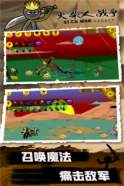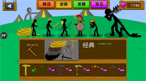 初期仅可招募矿工与棍棒手。矿工负责开采黄金,是经济命脉,但极其脆弱,务必搭配士兵保护。所有单位均可手动操控——点击角色即可接管,左侧控制移动,右侧执行攻击或挖矿动作,灵活运用不同兵种的技能是制胜关键。