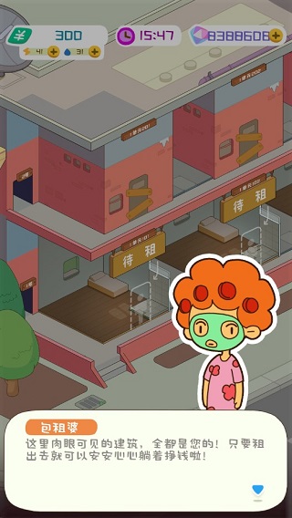 当前肉眼可见的建筑,全都是您的!下面只需要将房间租出去就可以安安心心的躺着挣钱啦!