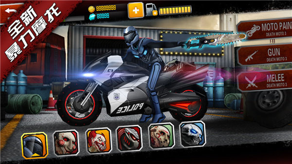 3. 装备升级机制:通过参与赛事可获得成长资源,用于提升摩托性能与武器威力,不断增强竞争力,在比赛中占据更有利位置。