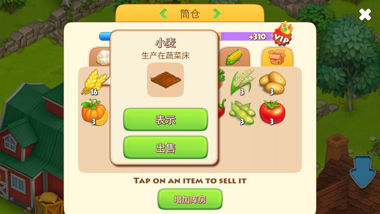 4、收获的作物都会存在库房当中,点击即可出售。