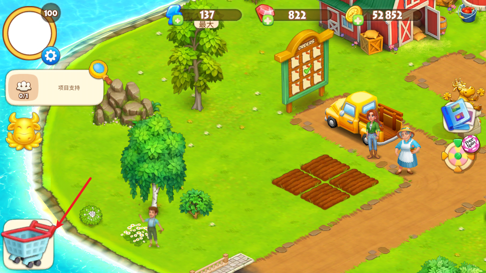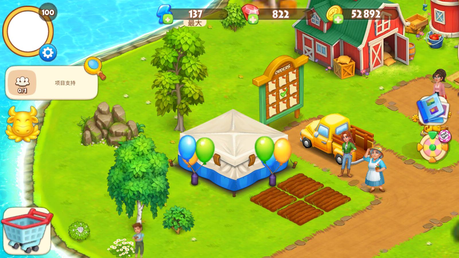 1、首先我们来尝试种植农作物,点击空地后,选择合适的种子,拖动即可种满田地。