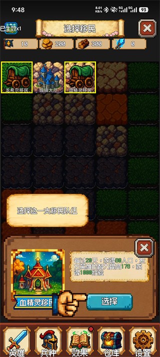 建议选择血精灵移民”种族,该选项能带来持续性收益:每20天自动获得80人口、英雄智力+178以及1000经验,显著加速中后期英雄成长节奏,提升整体战力。