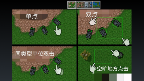 首先简单说明操作,点击单位是选择这个单位,快速双击某单位能选中屏幕视线类相同的单位,持续按住屏幕能以按住点为圆心,持续扩大半径,大范围选取单位,同时点击屏幕两点,能在两点间形成矩形对单位进行框选