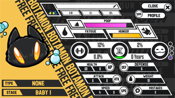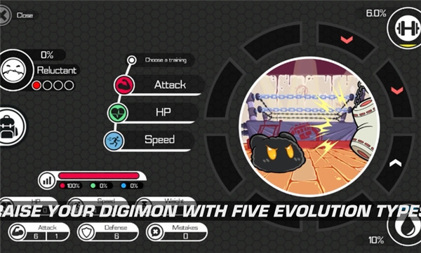 5、数码兽详情查看:点击左上角信息按钮可查阅数码兽详细数值,通过系统训练触发进化条件。