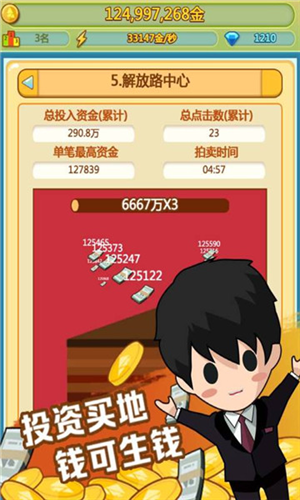 游戏以点击+放置”为核心机制,初期通过手动点击角色获取金币,逐步解锁各类商铺与产业。随着资产积累,系统将自动为你产生收益,真正实现钱生钱”的复利效应。不要囤积现金——投资土地、扩建店铺、招募店长、发展粉丝经济,才是快速致富的关键。后期每秒收益可达数亿金币,让你彻底告别手动操作,享受躺赢快感。