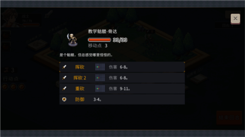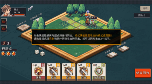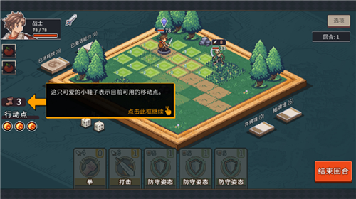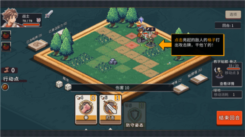 进入游戏后,你将通过直观的界面操作展开冒险:点击怪物可查看其属性与技能;左下角鞋子”图标显示当前可移动格数;行动点用于释放卡牌技能——防御类卡牌点击角色使用,攻击类则直接作用于目标敌人。当行动点耗尽,即可结束回合。注意:防御效果仅持续一回合,需合理安排技能释放时机。此外,你还能在设置中自定义结束回合”为点击或长按,提升操作流畅度。
