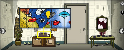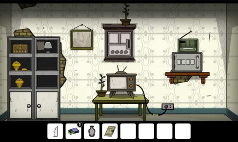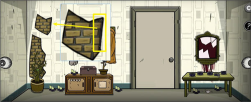 30、左转至电视机场景,注意挂画右下角图案;用【胶带】修复断开电线,按日记线索旋转电视按钮,屏幕碎裂后获得第二张【纸片】。