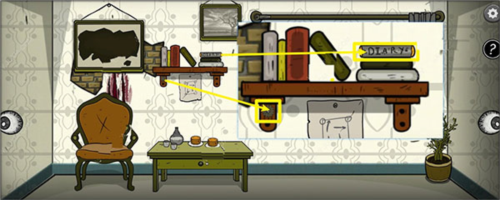 15、返回窗户场景,查看书台下方纸张的方向提示;再回厨房,按方向符将四个【把手】安装至左侧柜右上格,打开后获得装有【心】的玻璃瓶,用【螺丝刀】或【美工刀】打破取得【心】。