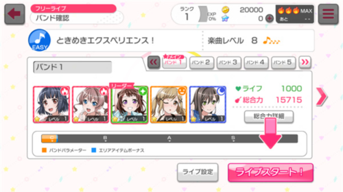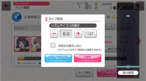 在演出前,你可自定义出场乐队、调整谱面下落速度(默认5.0),并确认队伍配置。操作方式直观易上手:单点、同押、长条、滑动及特殊黄点技能键(触发角色技能如分数提升、判定强化或回血)。完成演出后,系统将根据表现结算分数、评级与奖励,并分配Rank、角色及乐队三方经验值,推动剧情与成长同步解锁。
