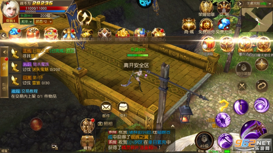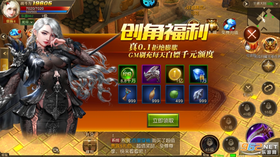 开服狂欢海量福利,每日豪礼签到送,登录送,比拼送!永久精灵、炫酷神翼、传说坐骑、限量称号、绝版时装免费领;百变天使、随身“恶魔”通关拿,幻彩装备比拼得!