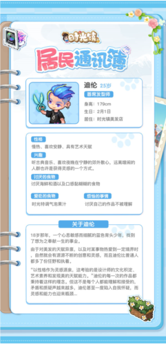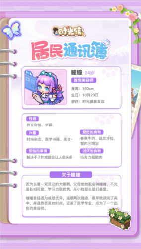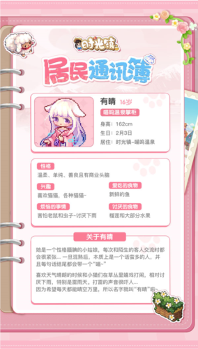 迪伦是镇上的首席Tony,总能用一句换个发型,给生活加点新鲜感”点亮你的造型灵感;瞳瞳作为美容师,掌握让人变美的魔法”,助你焕发自信光彩;而有晴则是喵呜温泉的掌柜,温柔地邀请疲惫的你说:来泡泡热乎乎的温泉吧,喵~”
