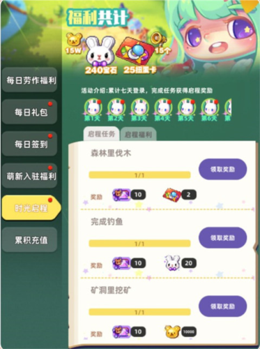 时光启程:完成指定任务链,累计可获得240塔米宝石、25扭蛋卡、15喇叭卡等稀有资源,每日任务刷新,奖励持续更新。