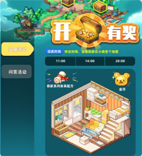 宝箱活动:每日特定时段,神秘宝箱随机刷新于小镇各处,每日可开启2次,有机会获得萌新系列家具配方与金币奖励。