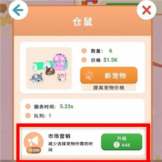 减少选择宠物所需时间:进入仓鼠”建筑界面,点击市场营销”右侧的升级”按钮,即可缩短顾客挑选宠物的等待时长。
